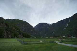 I was at Eidefjyord, surrounded by the gigantic walls of the mountain I’d just driven across,  with waterfalls cascading down them.  On another day it might have seemed beautiful, but at that point, against the dark grey sky, it all felt a bit intimidating.