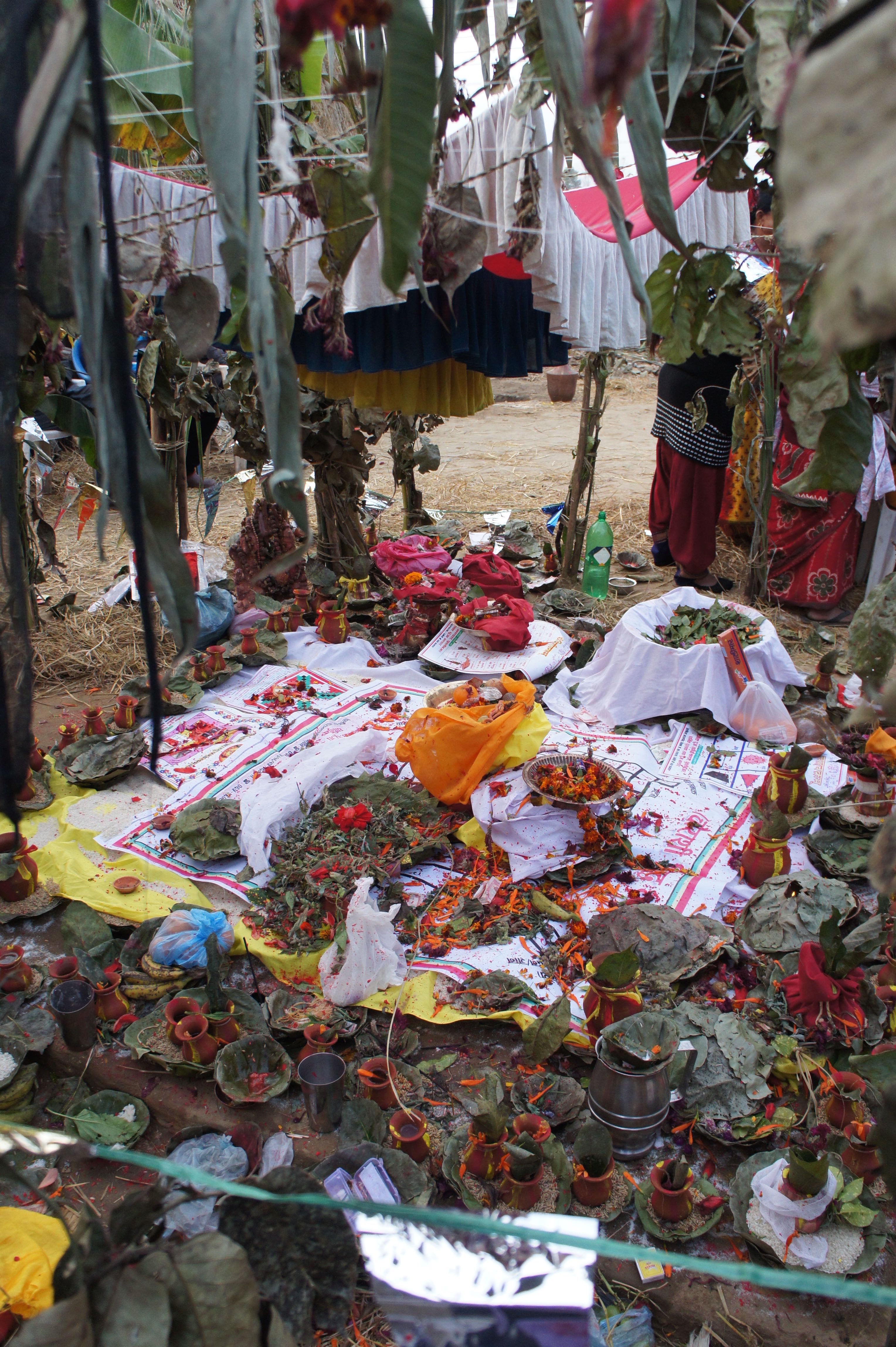 Just behind where the Birthday Lady and her entourage there was a big hole of the in ground which held a smouldering fire. There were some other people were gathered around it, throwing what looked like rice into it, and chanting. A third area was covered in bowls of water, incenses, flowers and coloured paste. It was a bright and colourful seen with lots going on.