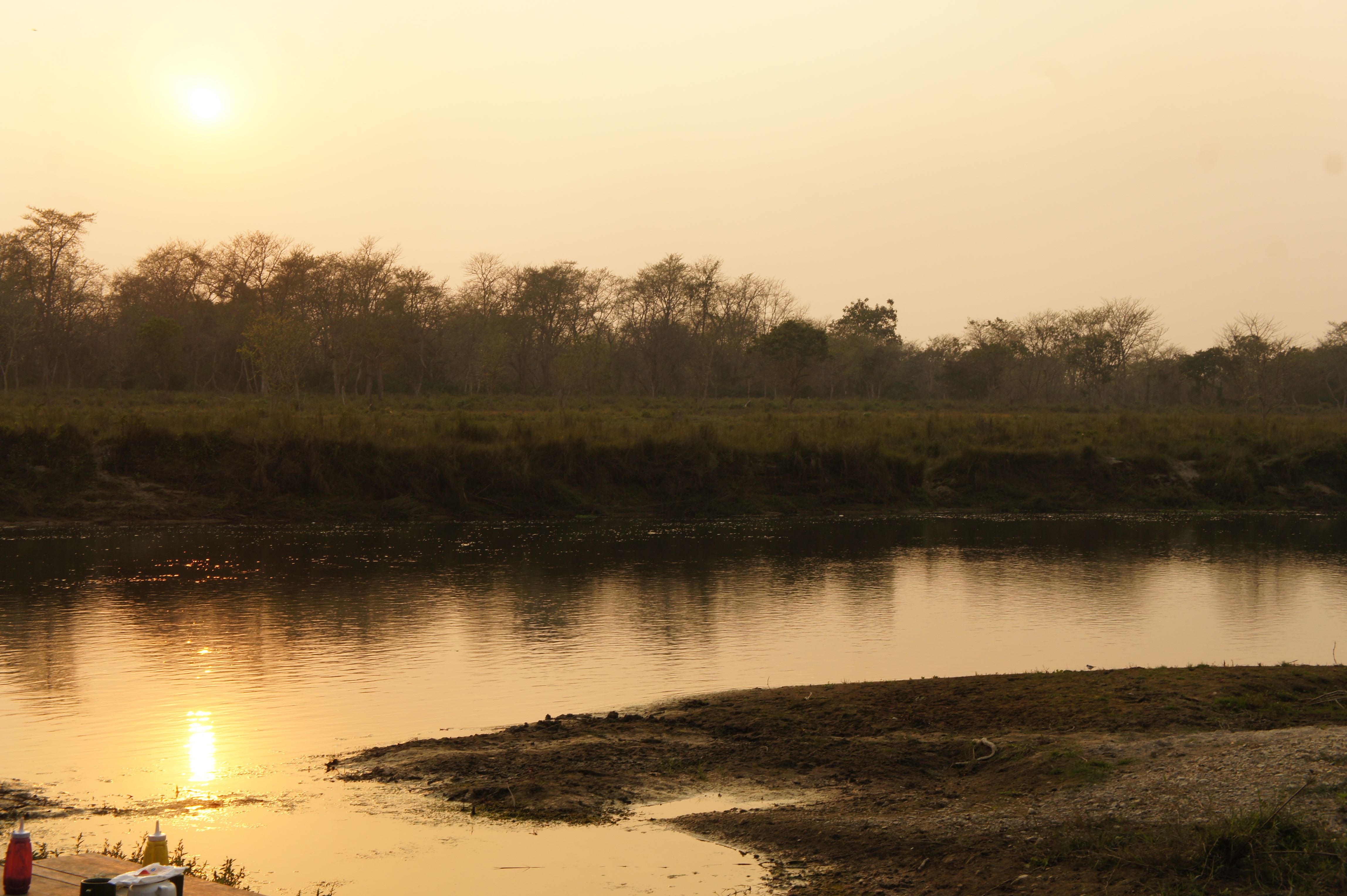 Later that first day, after the visit to the elephants, we drank cocktails whilst watching the sunset over the river and national park. After a meal, that for once wasn’t Dal Baht (whilst I’d enjoyed the traditional nepalese meal having it every day for breakfast and dinner is wearing a little thin now), we sat by an open fire for a bit before heading to bed.