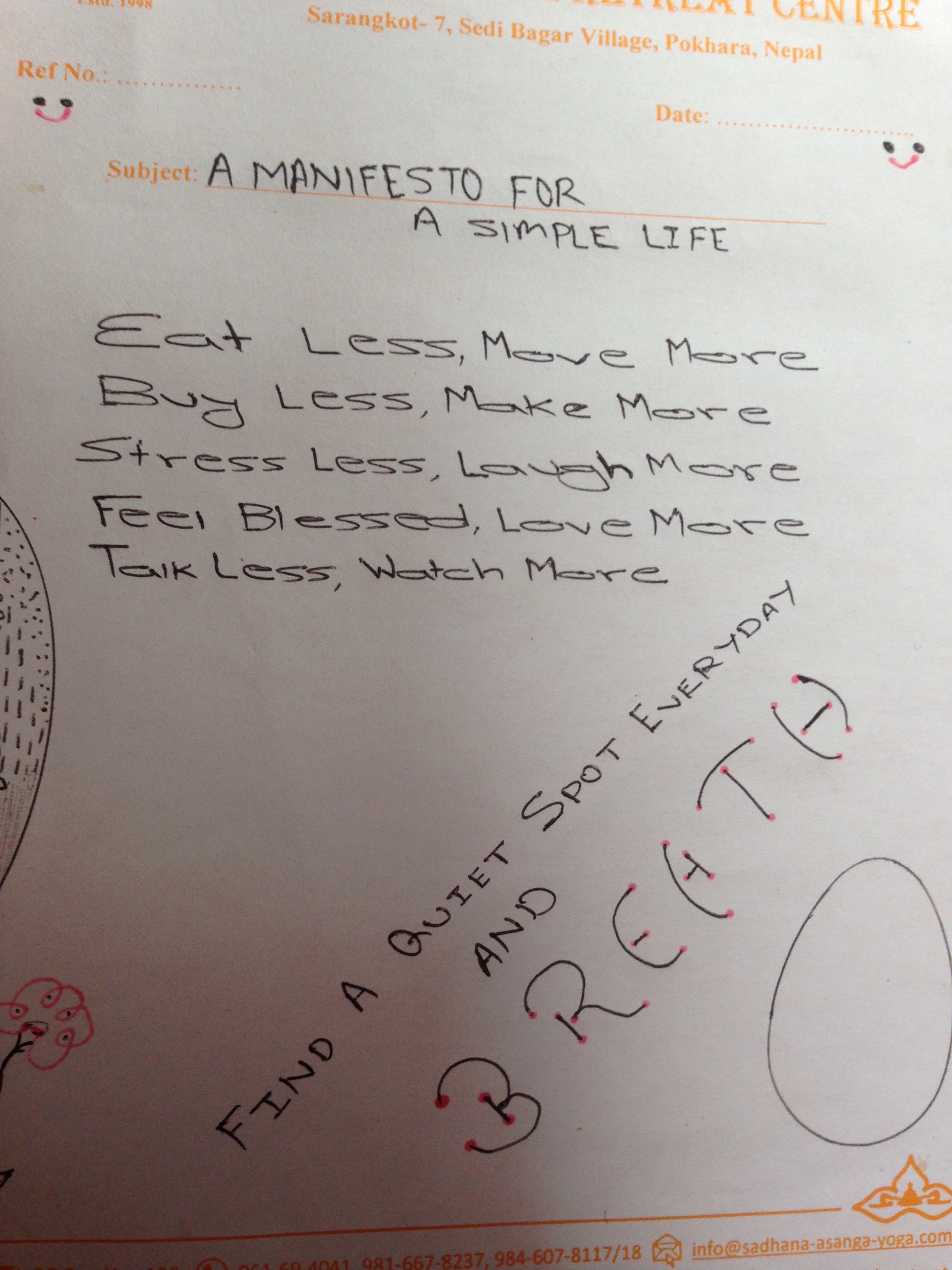 Day 1: The taxi took me round Fewa lake, up a seriously rocky and step road, through a small village and away from the tourists. It stopped by a path and from there I had to walk up a hill to the Sadahana Yoga Retreat, which is positioned high up looking over the Pokhara and the lake. You couldn’t see the retreat until you were more or less there.