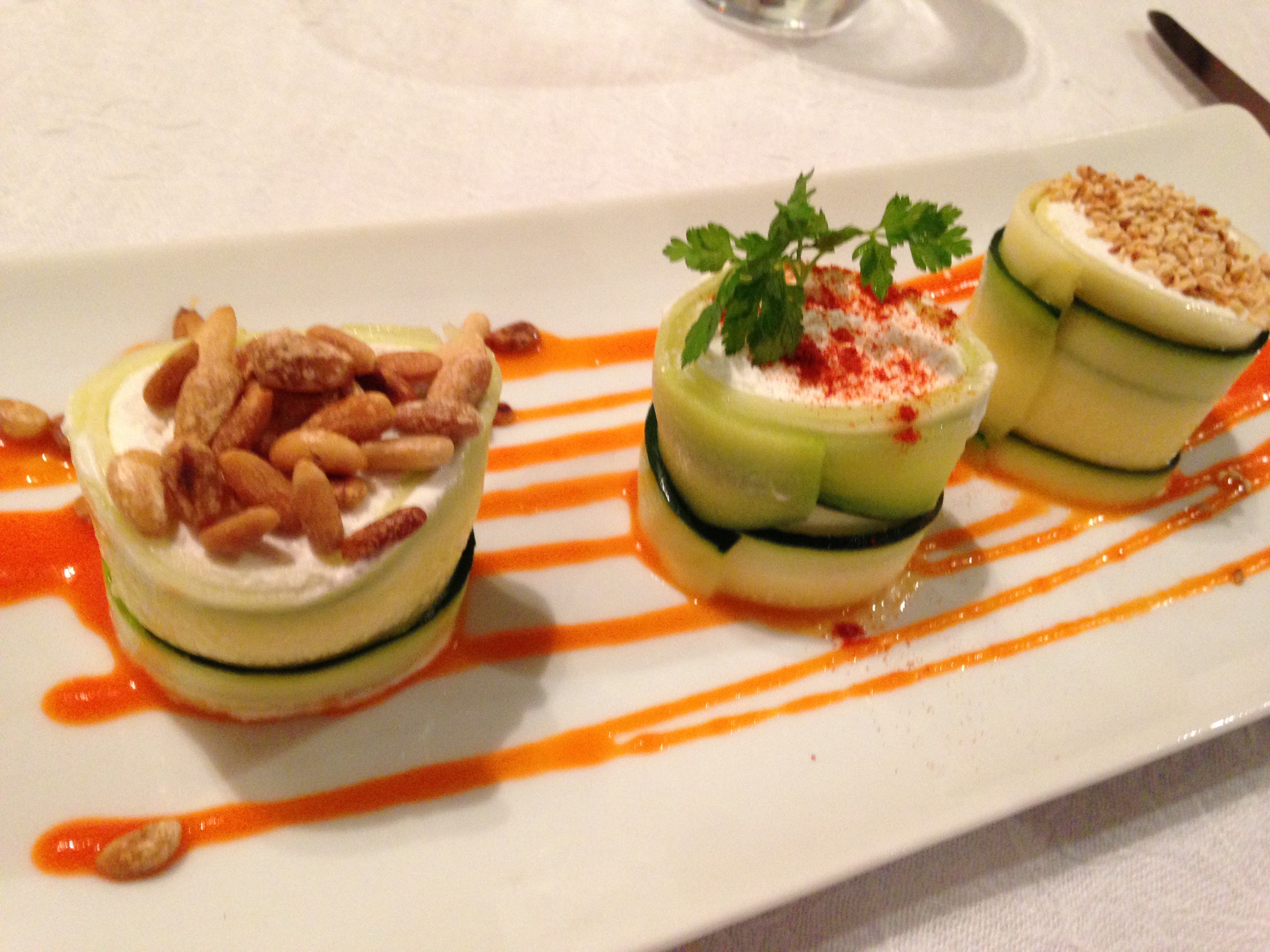 IMG_6708As I got nearer to the campsite I started seeing signs for wine caves – so as soon as I saw parking sign just after one I quickly pulled in. I tried a few chenin blanc’s, merlot and a savignon – all very nice and a perfect way to end the day’s drive. That night’s campsite was next to a restaurant – now at home I wouldn’t have bothered trying it with Alf but I was delighted when they let us both in – not batting an eye at Alf and thankfully they had an english menu as well. The meal was absolutely delicious – zucchini or courgette depending on what you want to call it wrapped around the creamiest goats cheese followed by a ballotine of crab and a coffee parfai. I don’t eat meat, but i do eat fish on occasion – which is lucky as there were no vegetarian options.
